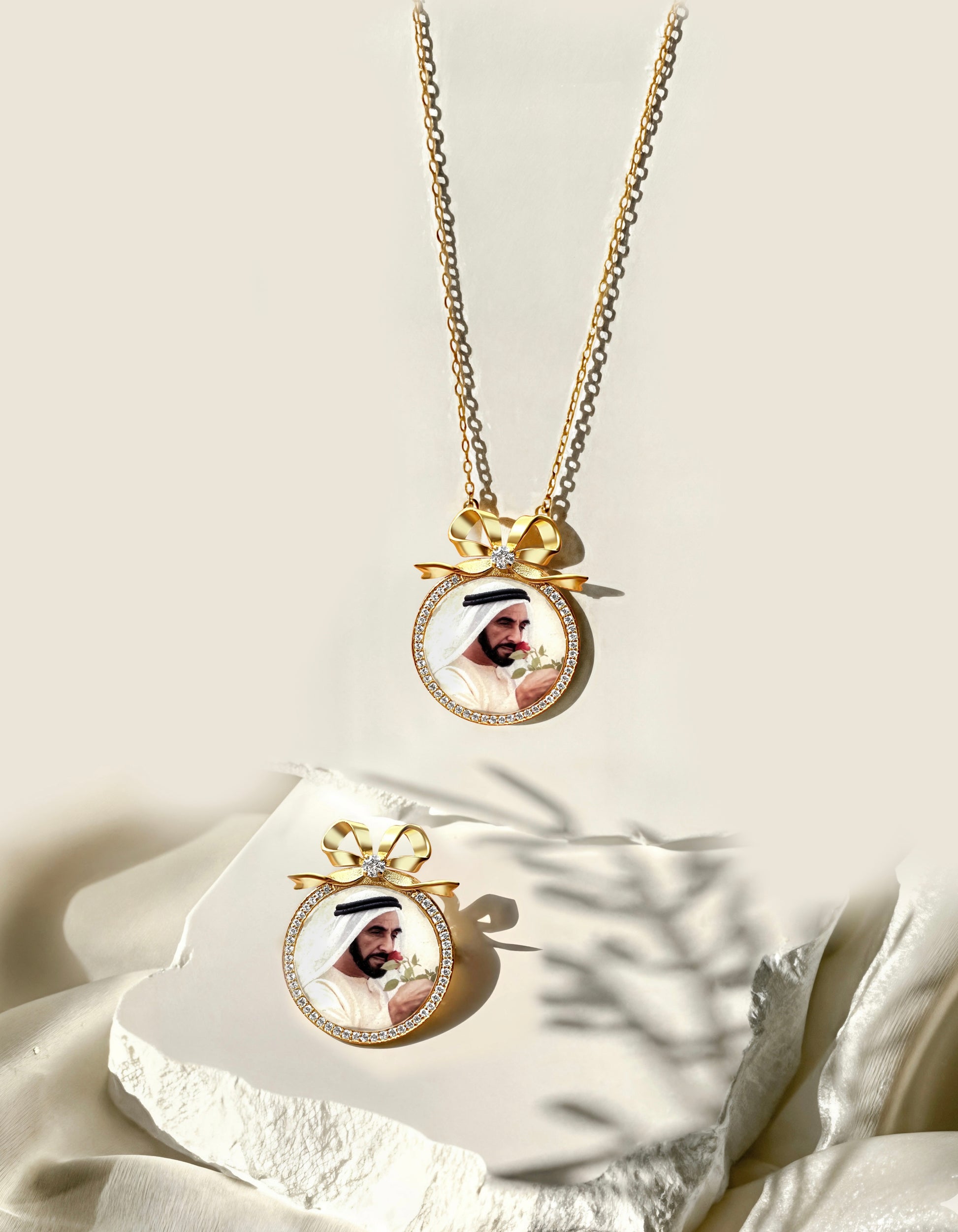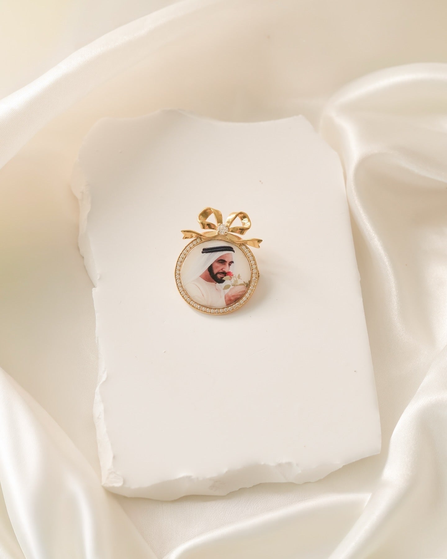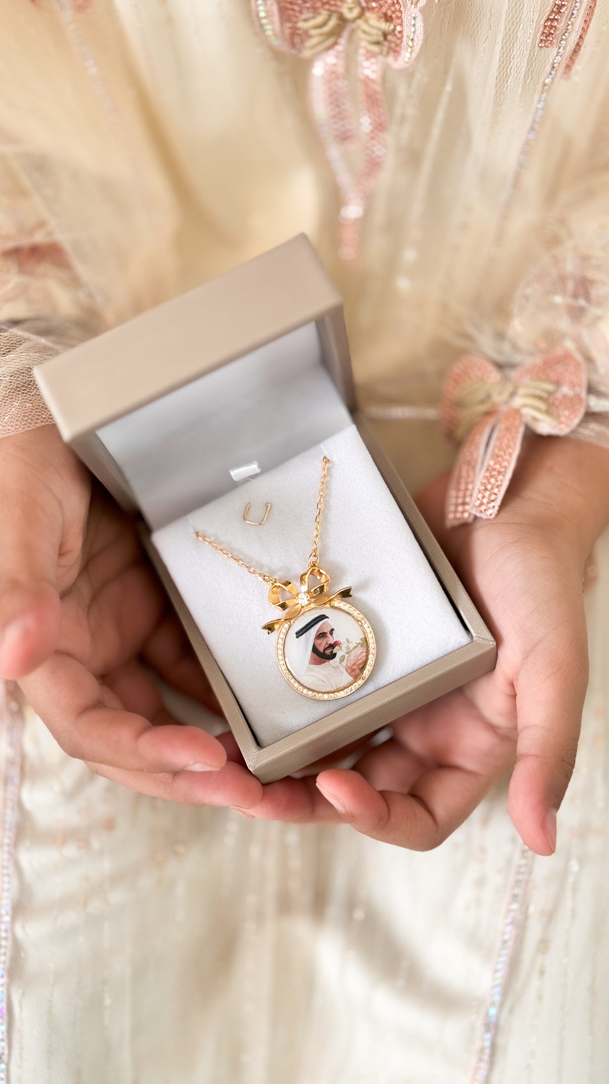 Elegant and timeless — featuring your cherished photo framed in gold with a delicate zircon sparkle and signature bow.