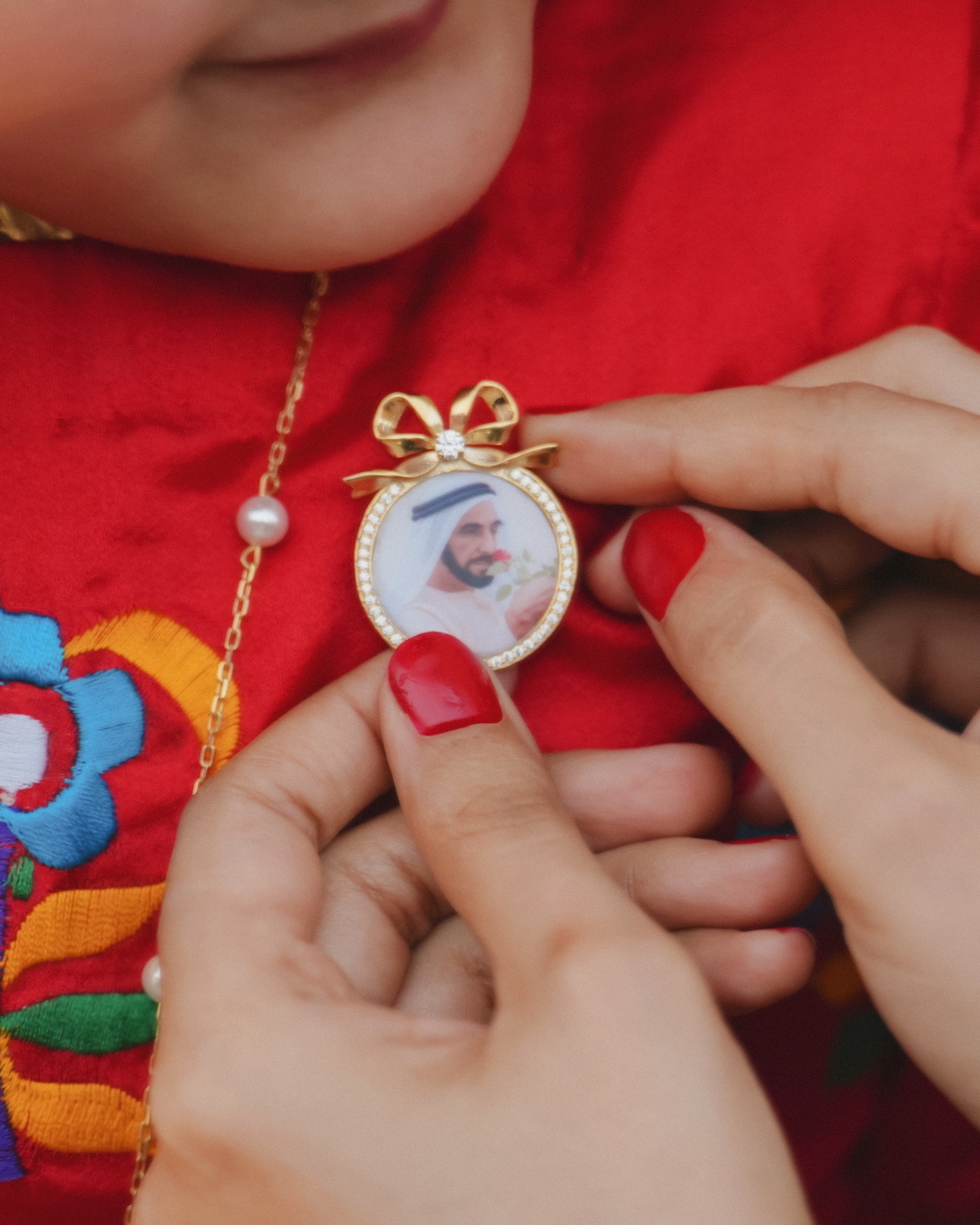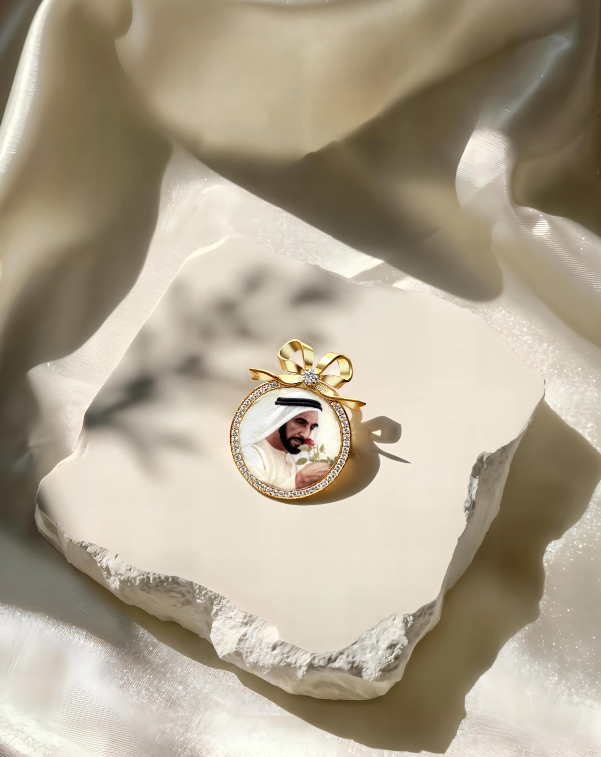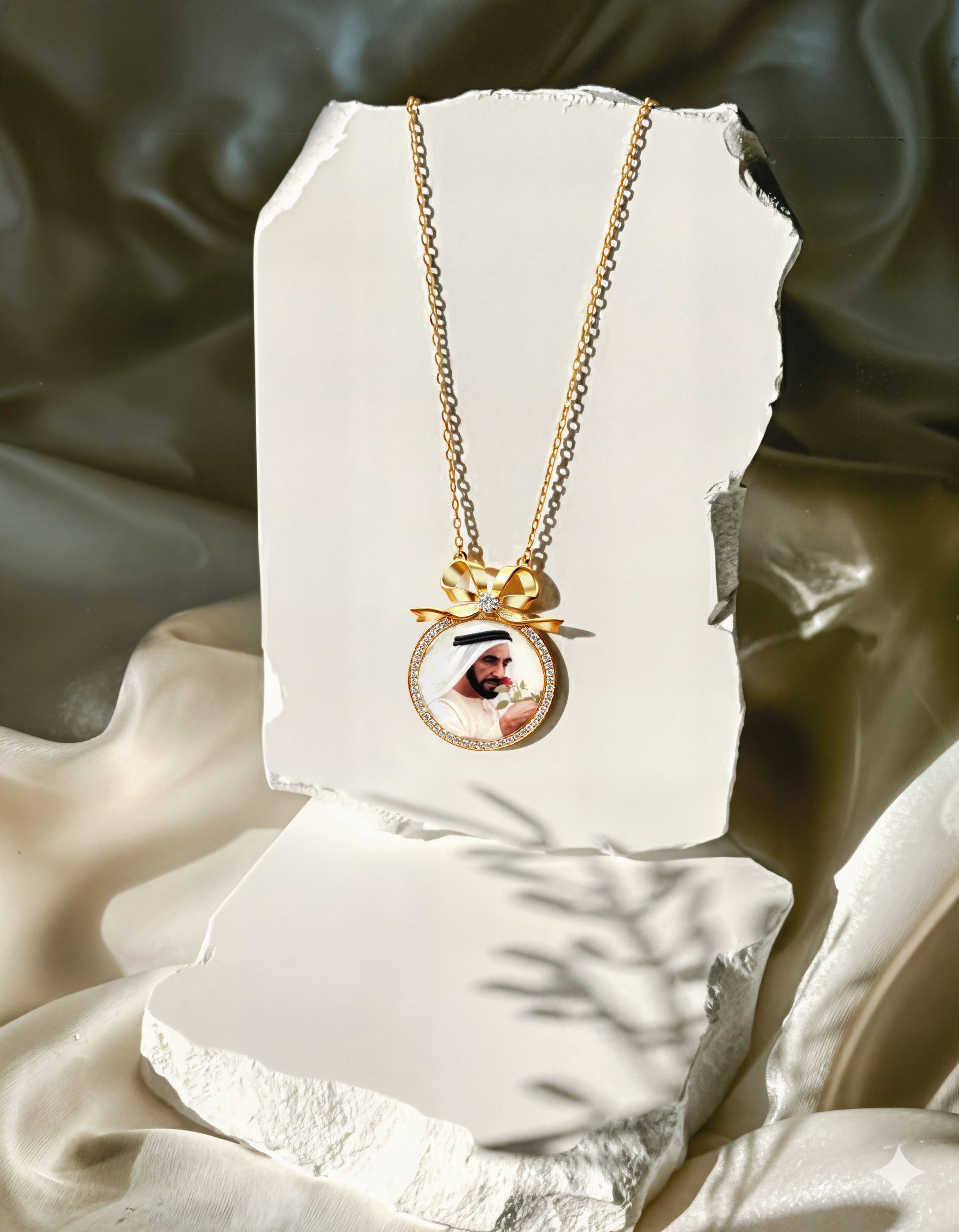 Elegant and timeless — featuring your cherished photo framed in gold with a delicate zircon sparkle and signature bow.